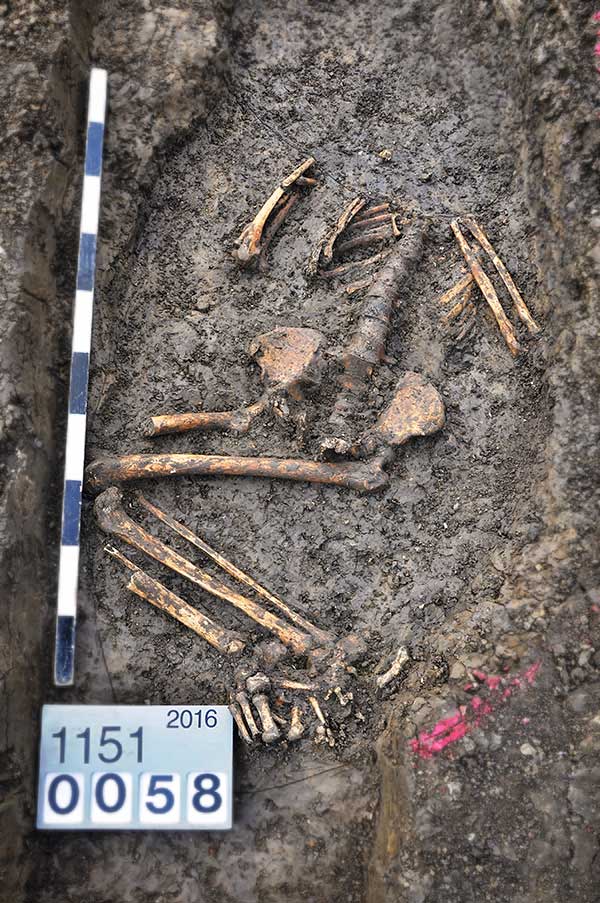 Entsprachen diese Ergebnisse noch durchaus den ursprünglichen Erwartungen der Denkmalpflege, gab es doch auch eine überraschende Entdeckung. Im Randbereich der untersuchten Fläche wurde ein Grab freigelegt, in dem ein Verstorbener in Schlafposition mit angezogenen Beinen und angewinkelten Armen auf der Seite lag, mit dem Kopf im Süden und den Füßen im Norden. Solche sogenannten Hockergräber sind vor allem für die späte Jungsteinzeit und frühe Bronzezeit charakteristisch, so dass die Bestattung auch ohne Grabbeigaben vorläufig dem Zeitraum zwischen 3.500 und 2.000 v. Chr. zugeordnet werden kann. Mit der späteren Siedlung hat diese Bestattung nichts zu tun: Ihr Kopfbereich wurde durch eine der Pfostengruben zerstört. Auch wenn die genaue Datierung noch aussteht: Zweifelsfrei handelt es sich hierbei um die Überreste des bisher »ältesten Balingers«.