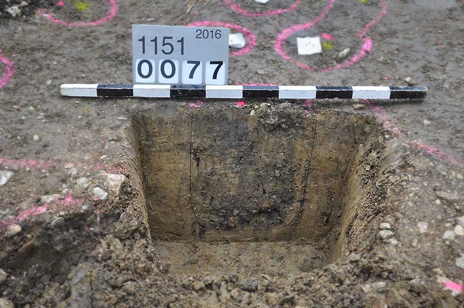 Die Mitarbeiter unter der örtlichen Grabungsleitung von Ernst Rümmele konnten in knapp dreiwöchiger Arbeit rund 200 Gruben und Pfostengruben von Holzbauten freilegen und dokumentieren, die sich im gewachsenen Boden als dunkle Verfärbungen abzeichneten.