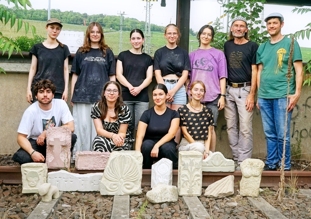 Zehn Studierende der Klassischen Archäologie haben den Hörsaal mit einem Pop-Up-Bildhaueratelier auf stillgelegten Gleisen am Würzburger Hauptbahnhof getauscht. Dort bekamen sie am 18. und 19. Juli 2025 eine Einführung in die antike Technik der Steinbildhauerei. Dieser Werkprozess hat sich bis heute nur geringfügig verändert, und auch die Werkzeuge der Antike unterscheiden sich nur unwesentlich von den heutigen Bildhauereisen.