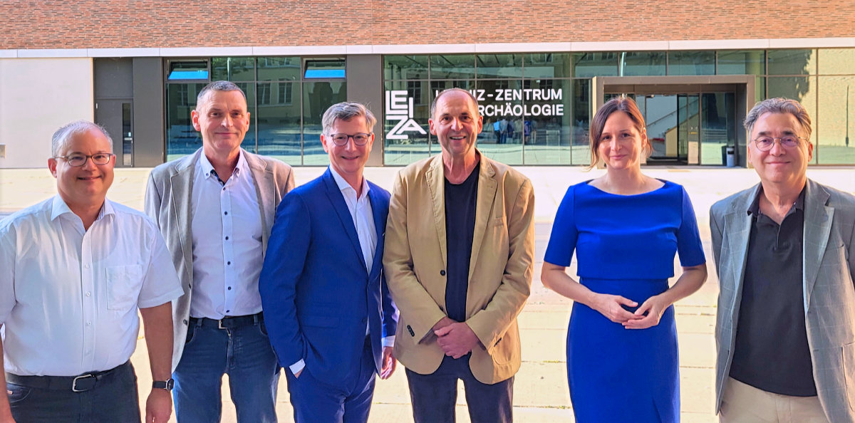 Rund 37 Jahre lang brachte Dr. Ronald Bockius seine Expertise und Begeisterung, vor allem für die antike Schifffahrt, in Forschung und Vermittlung ein. Nun verabschiedet ihn das Leibniz-Zentrum für Archäologie (LEIZA) in den Ruhestand. (von links nach rechts: Dr. Martin Schönfelder, Dr. Thomas Schmidts, Administrativer Direktor Dr. Torsten Fischer, Dr. Ronald Bockius, Generaldirektorin Univ.-Prof. Dr. Alexandra W. Busch, alle LEIZA, und Prof. Dr. Raimund Schulz, Universität Bielefeld, Festredner bei der Verabschiedungsfeier von Ronald Bockius am 30. Juni 2025)