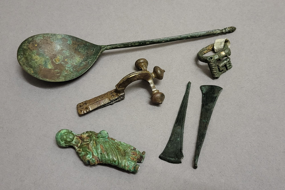 Die sieben Metallobjekte – darunter Fibeln, eine Statuette und andere Metallobjekte – wurden 1983 vom Landesmuseum angekauft, nachdem sie gemeinsam mit weiteren Stücken von einem Sammler angeboten worden waren. Als Fundort war damals "Bentumersiel" angegeben – ein bedeutender archäologischer Fundplatz an der Ems mit einem ungewöhnlich hohen Anteil von Funden römischer Militaria und Luxusgüter. Schon zu diesem Zeitpunkt des Kaufs wurden Zweifel laut: Denn in den damaligen Akten wurde vermerkt "angeblich Bentumersiel?".
