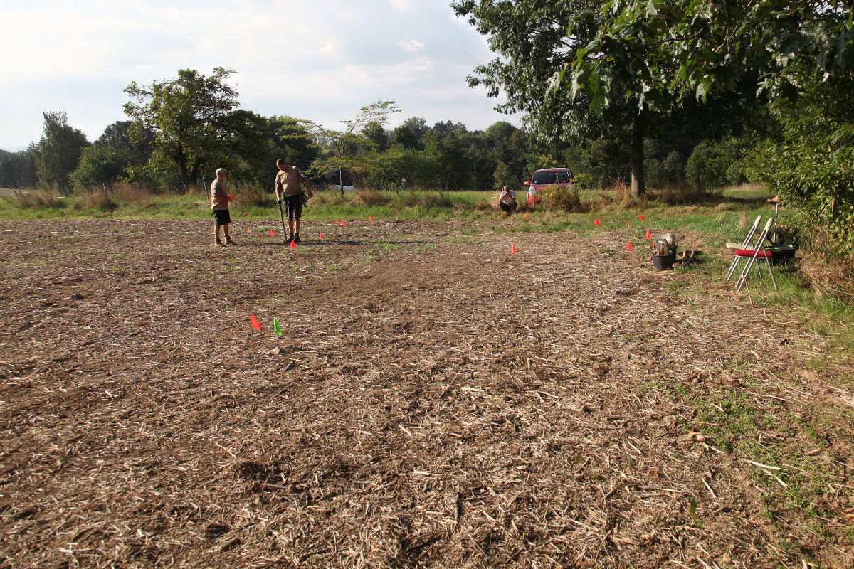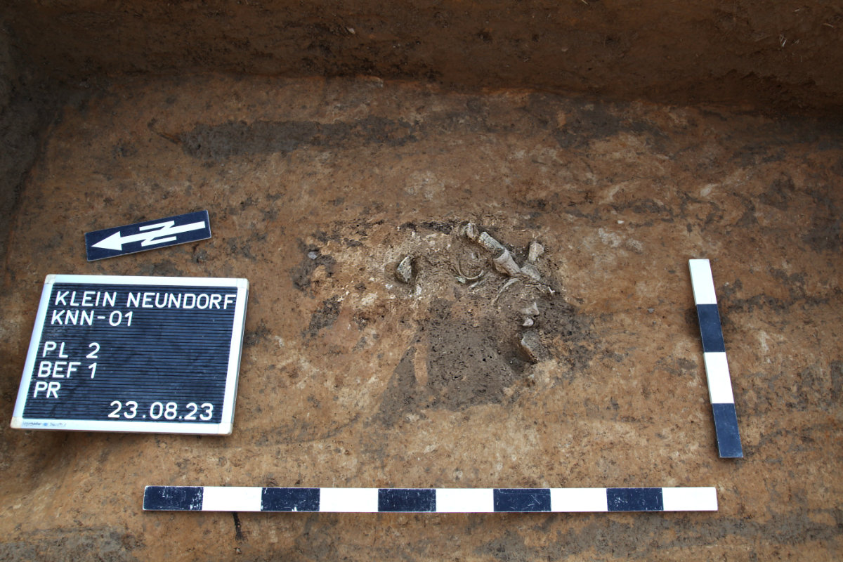 In zeitgenössischen Niederschriften wird die Fundstelle, die noch heute landwirtschaftlich genutzt wird, gut beschrieben, so dass das fragliche Gebiet enger eingegrenzt werden konnte. Die Nachsuche startete bei heißem Sommerwetter mit mehreren ehrenamtlichen Sondengängern und Fachleuten im August 2023 nördlich der Ortslage von Klein Neundorf auf einem abgesteckten Areal. Die Suche blieb zunächst erfolglos, bis der Sondengänger Henry Herrmann seine Nachforschungen auf den westlichen Rand der eingegrenzten Untersuchungsfläche ausdehnte und dort bronzene Sichelbruchstücke fand. Das übrige Team verlagerte die Nachsuche daraufhin in diesen Bereich und es wurden weitere Fundstücke im Pflughorizont entdeckt. An einer Stelle zeigte sich, dass mehrere Bronzegenstände auch noch »in situ«, also ungestört am ursprünglichen Ort der Deponierung im Boden lagen.