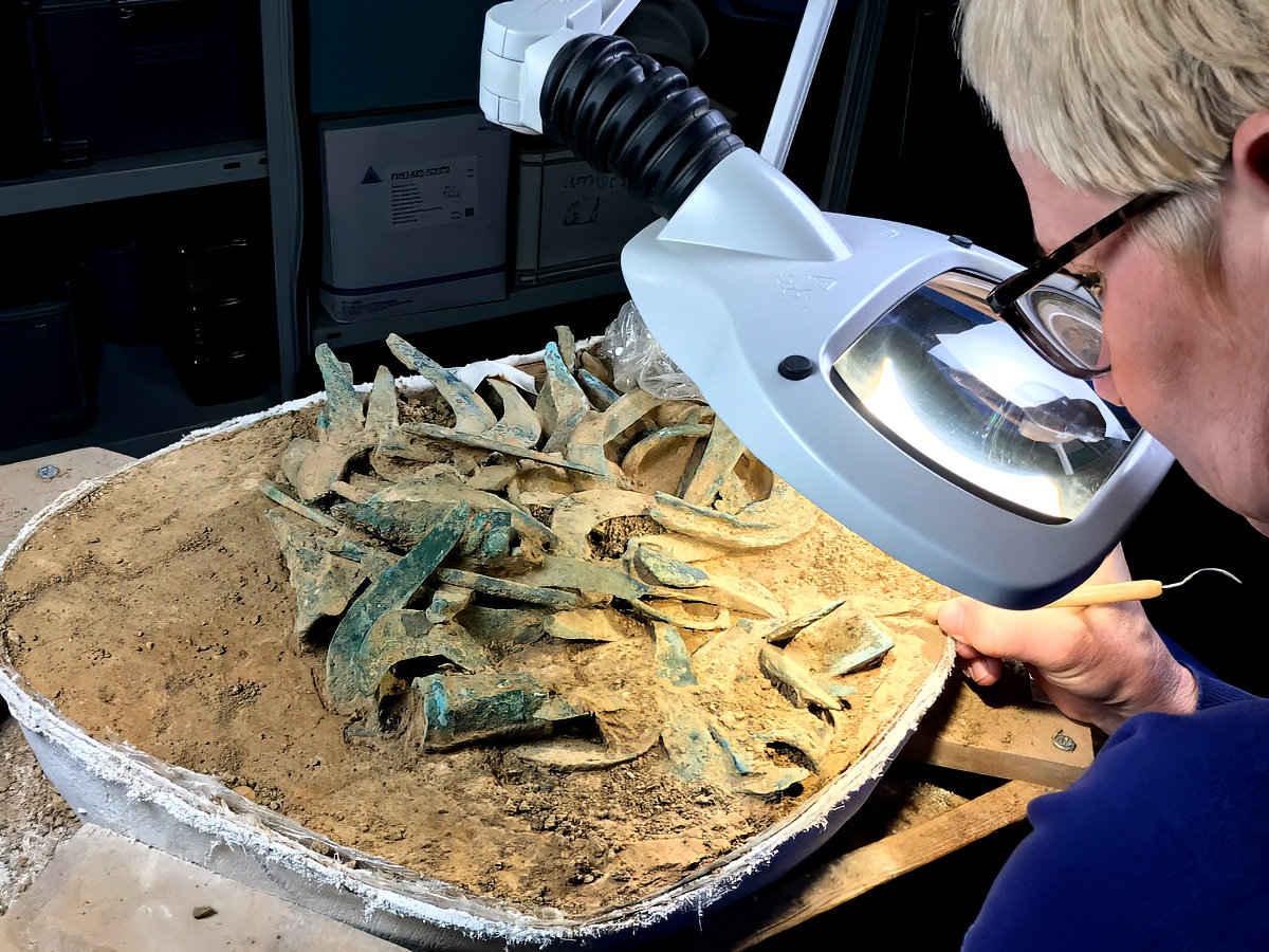 Dieser eng beieinander liegende Komplex wurde am nächsten Tag von ausgebildeten Grabungstechnikern des Landesamtes als Block geborgen. Bei dieser Methode wird die Fundstelle mit dem umgebenden Erdreich en bloc - also im Ganzen - geborgen, damit sie dann in der Restaurierungswerkstatt untersucht werden kann. Der Block wurde von September 2023 bis Ende April 2024 im Landesamt für Archäologie Sachsen freigelegt und dokumentiert. Zudem wurden 3D-photogrammetrische Aufnahmen angefertigt, damit das Ensemble und die einzelnen Fundstücke in ihrer Lage zueinander für weitere wissenschaftliche Analysen jederzeit rekonstruierbar bleibt.