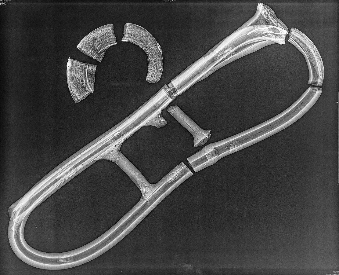 Im Rahmen der nun abgeschlossenen Restaurierungsarbeiten im BLfD konnte die Trompete fast vollständig zusammengesetzt werden. Lediglich das Mundstück und ein Teil des Schallbechers fehlen. Bemerkenswert ist die silbern glänzende Glasur, die das Instrument an einigen Stellen umgibt. Mit großem handwerklichem Geschick wurde das gewundene Tonrohr vermutlich mit Hilfe einer ringförmigen Schablone gepresst, während der tönerne Schallbecher auf der Drehscheibe entstanden ist. Zwei senkrechte Stege zwischen den Rohrbögen sorgen für zusätzliche Stabilität. Durch seine Bauweise erinnert das knapp 44 Zentimeter lange Instrument an die Form metallener Trompeten. Doch die Dorfener Trompete ist eine sogenannte Naturtrompete, ein Instrument ohne Ventile oder Klappen, bei dem die verschiedenen Töne allein durch die Spannung der Lippen erzeugt werden.