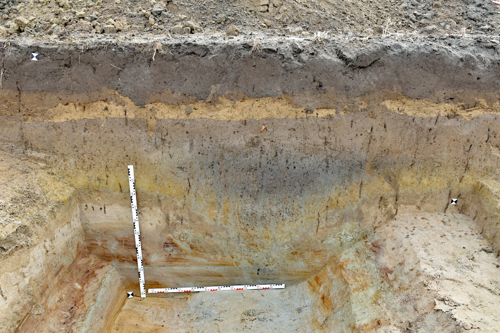 Zur weiteren Absicherung der Befundinterpretation erfolgten in den Sommern 2024 und 2025 gezielte Ausgrabungen an den jeweiligen Fundplätzen. In Aken 1 wurde auf einer Fläche von 10 mal 7 Metern der noch bis zu 1,75 Meter breite und 1,55 Meter tiefe Graben erfasst. Er zeigt die charakteristische V-Form eines römischen Spitzgrabens. Auch in Aken 2 wurde ein charakteristischer Spitzgraben mit einer Breite von 1,8 Metern und einer Tiefe von 1,5 bis 1,6 Metern festgestellt. Im Südosten wurde zudem das Ende des Grabens (Grabenkopf) beziehungsweise der Teil einer Grabenunterbrechung dokumentiert. Genau hier wurde bereits im Vorfeld der Grabung aufgrund der vorausgehenden Untersuchungen der westliche Zugang ins Lagerinnere vermutet. In Trabitz gelang mit einem Grabungsschnitt von 10 mal 3,5 Metern ebenfalls der Nachweis eines Spitzgrabens – hier 1,7 Meter breit und 1,2 Meter tief. In Deersheim war der sehr gut erkennbare Spitzgraben bei einer ursprünglichen Breite von 1,5 bis 1,7 Meter nur etwa einen Meter in den Verwitterungshorizont des anstehenden Kalksteins eingetieft.