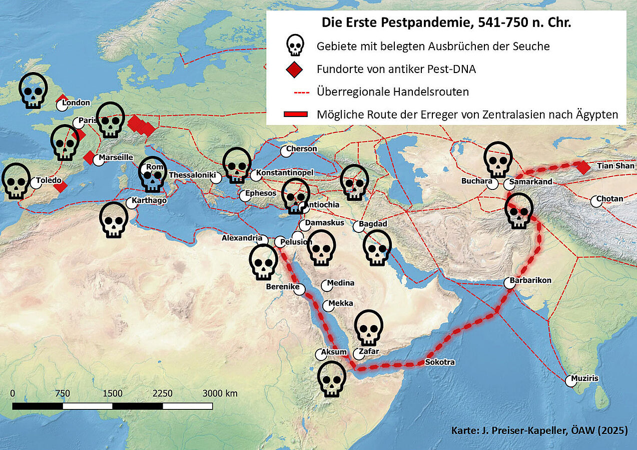 Entweder gelangten Varianten der Erreger kurz vor dem ersten dokumentierten Ausbruch 541 in Ägypten über Handelsrouten aus Zentralasien nach Indien und von dort per Schiff ins Land am Nil – oder er wurde bereits Jahrhunderte zuvor nach Ostafrika eingeschleppt und entwickelte sich dort zu den später so verheerenden Stämmen. »Unsere Untersuchung zeigt, dass beide Wege aufgrund der historischen und ökologischen Bedingungen plausibel sind«, erklärt Johannes Preiser-Kapeller.