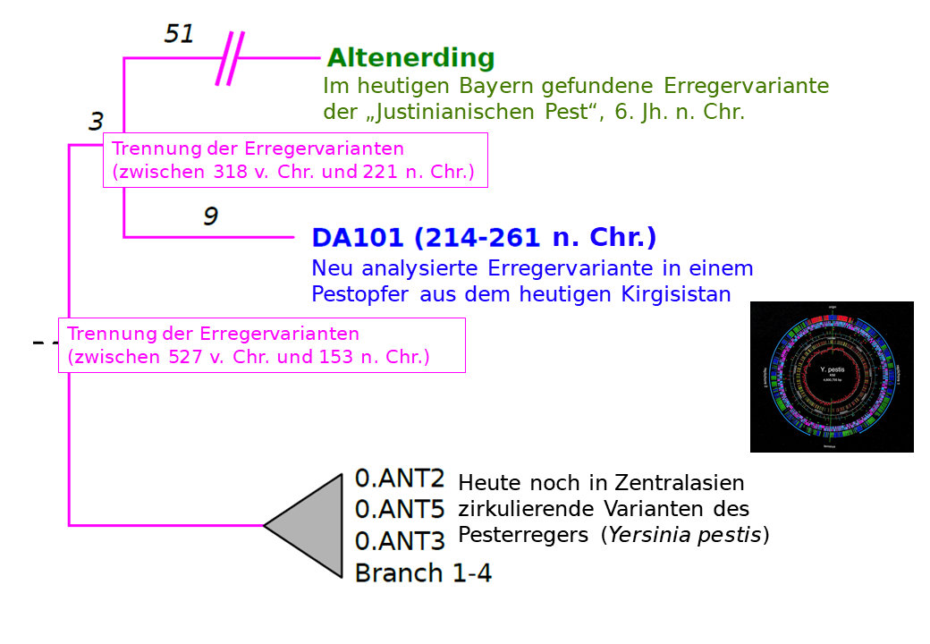 Dass die Erreger der Ersten Pestpandemie – ähnlich wie beim mittelalterlichen »Schwarzen Tod« – aus Zentralasien stammen, wo das Bakterium Yersinia pestis bis heute unter Wildtieren vorkommt, wurde lange Zeit vermutet. Ein Fund antiker Pest-DNA aus der Zeit um 200 n. Chr. nahe des Tian Shan-Gebirges in Kirgisistan schien dies zu bestätigen. Die neue Analyse zeigt jedoch: Diese Variante ist genetisch weiter von den Erregern des 6. Jahrhunderts entfernt als ursprünglich gedacht.
