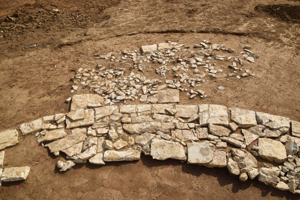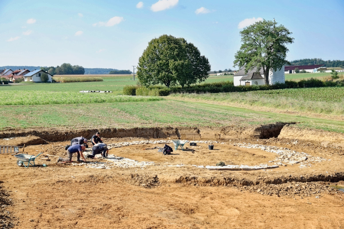 Zunächst wurden bei der Grabung vorgeschichtliche Siedlungsspuren und Keramikfragmente entdeckt. Unerwartet traten dann die Reste eines massiven Steinfundaments zutage: ein runder, sorgfältig gesetzter Kreis mit einem äußeren Durchmesser von etwa zwölf Metern. An der Südseite schließt sich ein quadratischer Anbau von zwei mal zwei Metern an, der vermutlich als Fundament für eine Stele oder Statue diente. Die hochwertige Bauweise und das Gesamtbild lassen kaum Zweifel: Der Steinkreis bildete die Ringmauer eines Tumulus aus der Römerzeit.